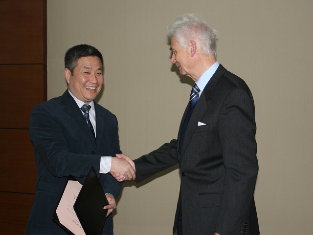 汪莹介绍了出席聘任仪式的相关人员。陈实介绍了Herbert W. Roesky教授的有关情况。赵长禄代表学校致欢迎辞,感谢Roesky教授接受学校的聘请,并希望Roesky教授在今后的工作中为学校的发展和化工与环境学院的学科建设作出更大的贡献。在热烈的掌声中,赵长禄向Roesky教授颁发聘书并佩戴校徽。Roesky教授表示很荣幸能够成为beat365教师队伍中的一员,愿意竭尽所能为学校的教育事业和化工与环境学院的长远发展作出自己的贡献。孙克宁表示,Roesky教授多年来致力于绿色化学的研究,取得了世界公认的卓越研究成果,在世界化学领域上有很高的声誉。聘任Roesky教授为本学院兼职教授对于快速提高本学院的学术水平, 加强学院与国外高水平学术机构的学术交流将起到非常重要的作用。