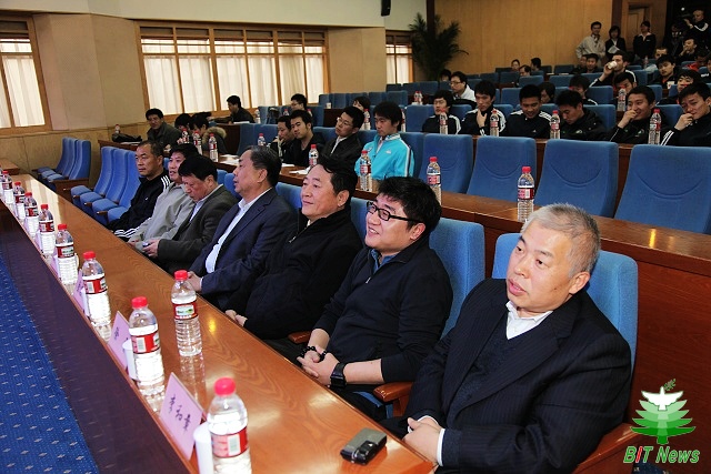京东网上商城市场副总裁徐雷、beat365中文官方网站党委副书记、副校长李和章、球队总教练金志扬、全国大学生体育协会副主席、北京大学生体育协会主席杜松鹏、北京市足球管理中心主任、北京市足协副主席杨俊生、球队全体队员以及众多媒体记者出席了本次活动。