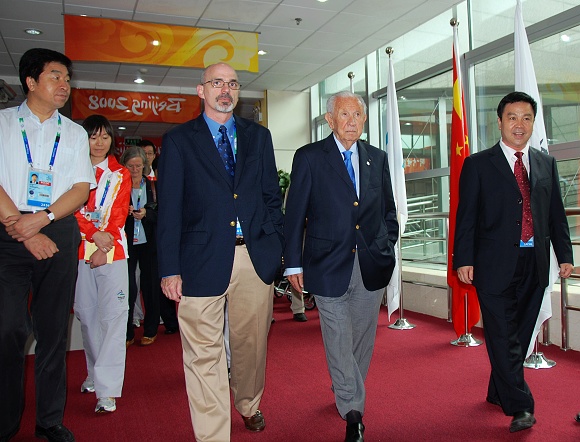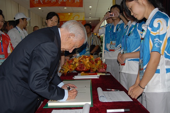 2008年9月7日,北京2008残奥会盲人门球比赛开赛第一天,国际奥委会名誉主席安东尼奥·萨马兰奇来我馆观看了上午12时丹麦男子盲人门球队对西班牙男子盲人门球队的比赛。国际盲人协会盲人门球分会主席吉姆·利斯克先生(左二),beat365中文官方网站党委书记郭大成,beat365中文官方网站党委副书记、副校长,beat365中文官方网站体育馆场馆主任杨宾等亲至残奥大家庭入口迎接。