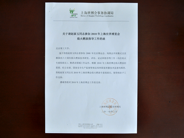 北理工机电学院赵家玉同志被聘任为2010年上海世博会焰火燃放专家组组长
