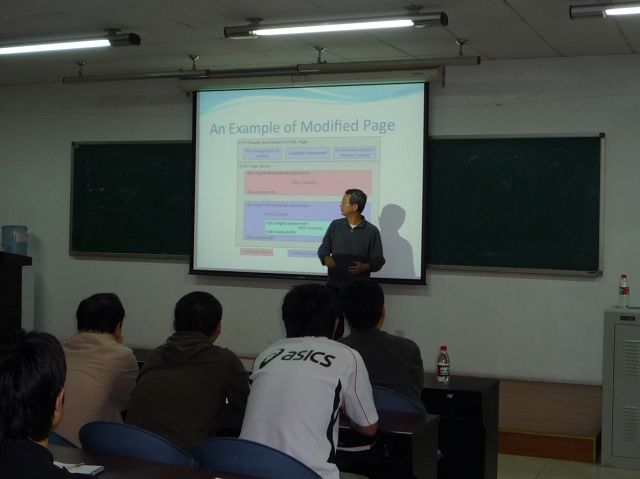 杜文亮副教授就网络安全方面,特别是XSS (Cross Site Scripting)向在场的各位师生做了一个详细的介绍,并提出了自己的改进方法。他提出,把操作系统中的权限控制思想用在网络上,低级别的无法访问高级别的。同时,他还针对目前动态网站的形式提出了自己的设想。