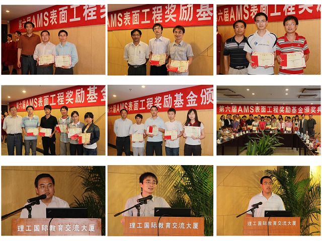 王鲁为王扬卫、宁先进两位年轻骨干教师颁发AMS表面工程优秀教师奖。曹传宝、李树奎为卢林等四位研究生同学颁发AMS表面工程优秀研究生奖。宋希剑为常云鹏等十名本科生同学颁发AMS表面工程优秀本科生奖。李志刚、王华、王全胜为王灿等二十名同学颁发AMS表面工程助学金。