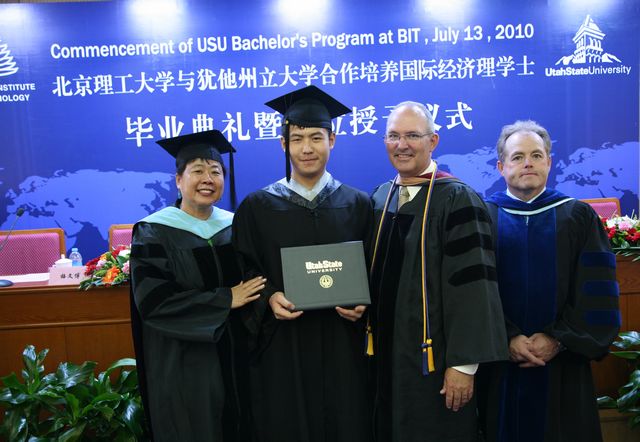 在优美的毕业音乐声中,犹他州立大学国际合作教育处主任Li Li博士宣读了53名荣获犹他州立大学学士学位的毕业生名单,副院长Dr .Chris Fawson,Li Li博士和Dr. Tyler Bowles给毕业生颁发了学士学位证书并一一合影留念。Dr. Tyler Bowles代表犹他州立大学Jon M. Huntsman商学院授予李璐同学2010年度杰出毕业生称号,并颁发犹他州立大学Jon M. Huntsman商学院杰出毕业生奖牌。