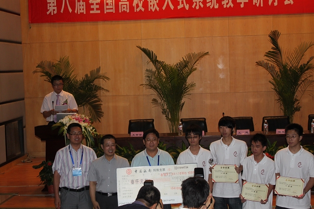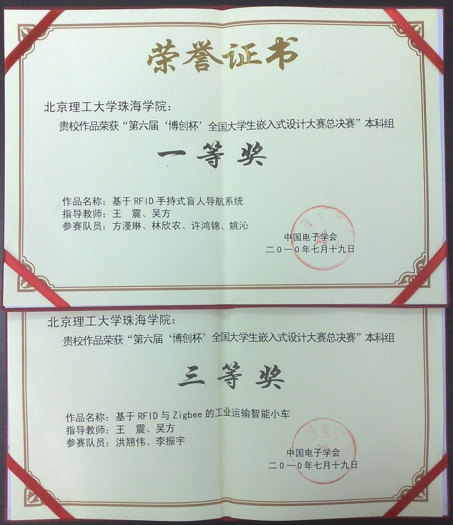 7月19日,由中国电子学会主办的第六届“博创杯”全国大学生嵌入式设计大赛全国总决赛在中国农业大学圆满落幕。珠海学院计算机学院由王震老师和吴方老师共同指导的两支代表队分别以《基于RFID手持式盲人导航系统》和《基于RFID与Zigbee的工业运输智能小车》作品,荣获全国本科组一等奖和三等奖的佳绩和三等奖的佳绩。