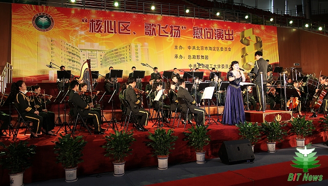 随后,总政歌舞团为北理工师生带来了《红旗颂》、《天鹅湖》组曲、 《春节序曲》、《蓝色多瑙河》圆舞曲、《瑶族舞曲》、《蝙蝠》序曲等中外名曲,著名女中音歌唱家姜丽娜、男高音歌唱家宋立忠和女高音歌唱家周晓琳分别演唱了《红梅花儿开》、《我的太阳》、《我爱你,中国》、《打起手鼓唱起歌》等大家耳熟能详的歌曲。