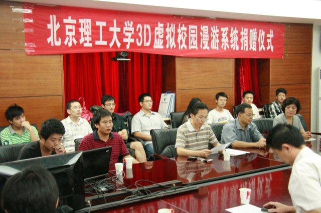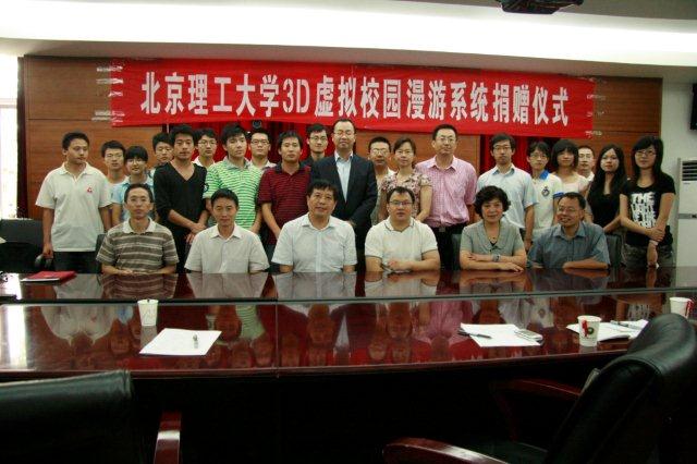 2010年9月15日上午,“beat365中文官方网站三维虚拟校园” 捐赠仪式在二号楼211会议室隆重举行。校党委副书记侯光明出席仪式并讲话,校办主任姚利民、党委宣传部部长(新闻中心主任)贺亚兰、副部长桑硼飞、网络服务中心主任陈朔鹰出席了捐赠仪式。参加捐赠仪式的还有beat365中文官方网站计算机学院党委书记郭彦懿、副院长廖乐健,北京理工篮园科技发展有限公司总经理从治琪、副总经理单飞以及项目开发团队部分成员。
