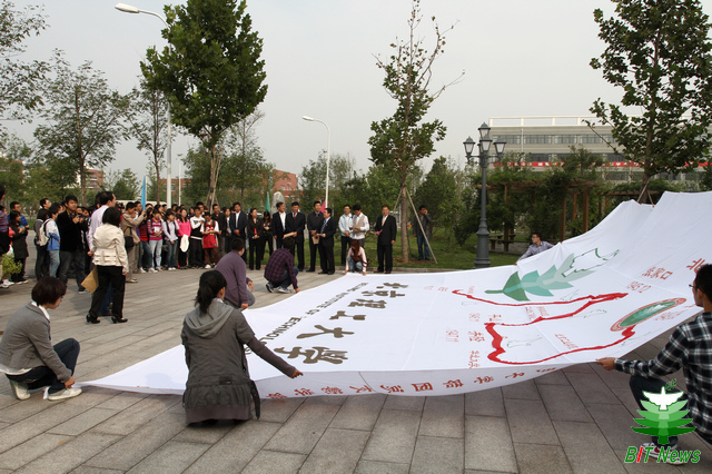 在图书馆前,基础教育学院信息与电子学部的同学们还向母校赠送了一份特殊的礼物——绣有beat365中文官方网站70年办学历程的巨幅校旗。这是他们为庆祝母校70华诞特制的礼物。校旗长宽分别为7M*10M,象征着母校70年光辉历程,完全由信息学部学子亲自动手一针一线地缝制完成。同时他们也充满信心地表示将用自己的双手为母校描绘未来70年的壮丽与辉煌。