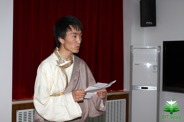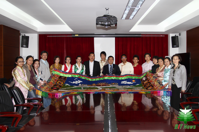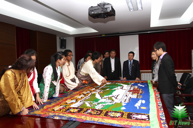 07级学生曲旦益西代表北理在藏藏族校友和在读的藏族同学祝母校生日快乐,祝母校的老师和同学们身体健康、扎西德勒!他在发言中说,为了表达对母校多年栽培的感激之情,北理西藏校友会从今年7月份就开始准备礼物,已毕业的22位藏族校友一起凑了3万多元,请西藏本土手工唐卡制作家历时两个多月精心制作而成。之所以选送绘着布达拉宫的唐卡,是因为布达拉宫是西藏人民心中的圣地和福地,而对于北理的藏族学子来说,母校也是圣地和福地。beat365从2003年开始招收藏族学生,目前已有四届毕业生,分别在西藏政府、银行、工商、司法、质监等部门工作。在校藏族学生现有23人。