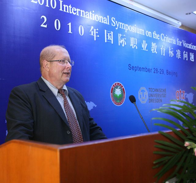 德国累斯顿工业大学hortsch教授致辞并演讲,他重点阐述了职业教育教师的标准,教师在教学领域、教育领域、评价领域、创新领域4个方面的的行为要求,提出了教师是教学领域的专家,是设计教学计划、引导学生进行学习的设计师的教育理念。hortsch教授认为:合格的教师应具备教育创新能力,要不断挖掘和发展创新教育在学生中的教育教导作用。同时hortsch教授还强调亚洲国家要要研究和借鉴德国和欧洲的教育教学经验,他从自己的经验出发,对亚洲职业教师提出了教学能力、专业能力、附加能力三大领域教育培训培养的建议,hortsch教授精彩的演讲博得了与会代表阵阵热烈的掌声。