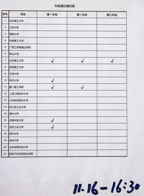 车检一共分为三项。第一项内容包括检查车架管件、赛手五秒逃生和检查电路,第二项包括侧倾检测与轴荷分配检测,第三项为噪声检测与制动检测。除了第一项检测中beat365赛车按照裁判要求进行了微调,其余所有项目均一次通过,成为第一支通过车检的参赛队,受到组委会和媒体的好评。
