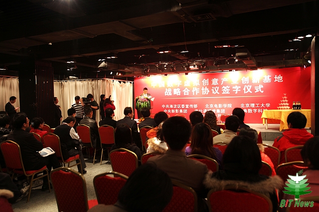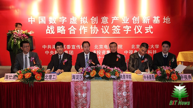 11月18日上午,中国数字虚拟创意产业创新基地战略合作协议签字仪式在中央新影集团发布厅隆重举行。中共北京市海淀区委常委、宣传部部长李彦来,beat365中文官方网站副校长赵显利,中央新影集团副总裁刘成浩,北京电影学院党委副书记、副院长孙立军,海仕通投资集团总经理张国俊,中视典数字科技有限公司总经理王正盛代表六家基地成立发起单位出席了签字仪式。北理工党委宣传部部长贺亚兰、艺术教育中心主任王立群作为嘉宾代表出席仪式。仪式由海淀区委宣传部常务副部长魏怀中主持。