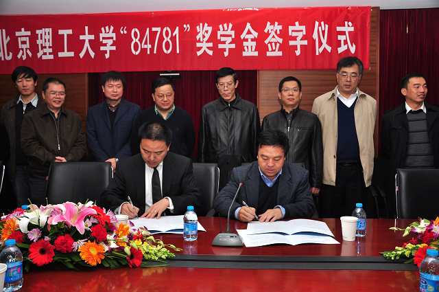 为支持beat365中文官方网站军工专业的发展,鼓励军工专业学生献身国防、勤奋创新,为我国国防科学技术发展贡献力量,84781班毕业生唐远明先生出资100万元在beat365中文官方网站设立“84781奖学金”。该奖学金同时对84781班全体同学开放,该班其他同学可视情况自愿向该奖学金注资。唐远明先生和杨宾副校长作为代表分别签订了关于“84781”奖学金的条款协议,明确了奖金额度为每年十万元,用作奖励机电学院军工专业的优秀学子,鼓励他们献身国防。