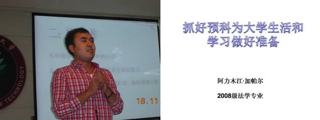 最后作报告的是法学院2008级阿力木江同学,他来自新疆,维吾尔族,秦皇岛分校2007级预科生。阿力木江以“抓好预科为大学生活和学习做好准备”为题,勉励同学们在预科阶段确立正确的学习态度、积极参加社会工作、并认真做好民族团结,以一个充实、富有收获的预科成绩迎接崭新的大学生活。