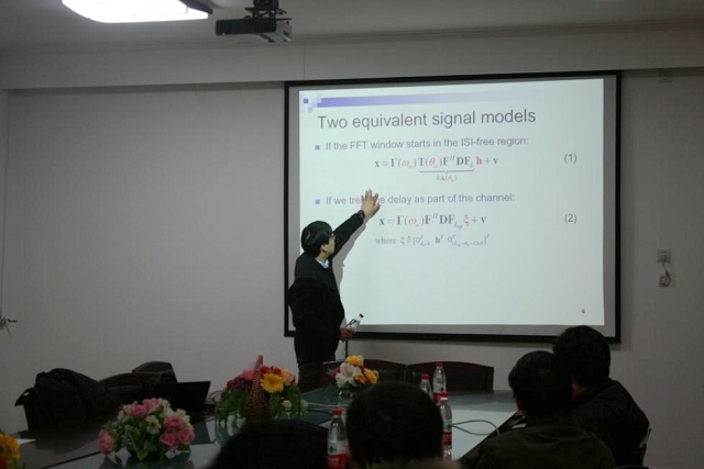 在报告开始,胡奕聪博士首先对其在香港大学的研究方向和现状进行了简要的介绍。接着,他主要讲解了OFDM系统中一种结合CFO的信道估计方法,并就相关性能分析和优化算法进行了深入的探讨,最后胡博士与信息与电子学院的教师和研究生就报告内容和相关通信领域知识进行了热烈的讨论与交流。
