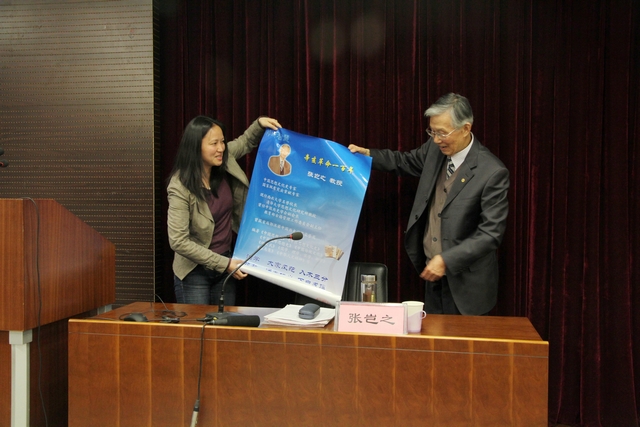 讲座结束后,学生工作处副处长许欣向张岂之教授赠送海报表达感谢和敬意。