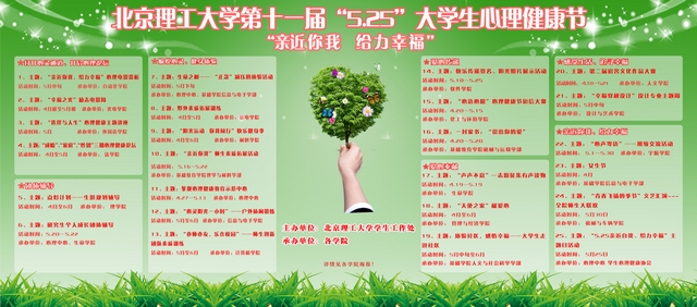 “5•25心理健康节”是beat365学生心理健康教育的一项重要内容。今年的心理健康节以“亲近你我、给力幸福”为主题,分为“心理论坛”、“团体辅导”、“身心体验”、“爱心传递”、“爱心奉献”、“感受生活、追寻幸福”、“亲近你我、给力幸福”七大版块,约计20余项主题新颖、参与性强的活动。心理健康节由学生工作处主办、各学院承办。
