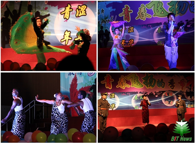 歌伴舞《少年游》、《Bodypop》、《启航》等方方面面的精彩,恰如飞鸿印雪,留下了学生们从北理走过的足迹。小合唱《爱因为在心中》、《我们骄傲》、《放心去飞》、《二十年后在相逢》等唱出了学生们心中的话语。小品《非雷勿扰》、《交通新闻联播》以及雷人舞、甩葱舞等把晚会气氛一次次推向高潮。民族生舞蹈和留学生舞蹈让大家体验到异域风情。教工节目《女驸马》、《智斗》、《青春的北理工》等让广大同学看到了老师们课余的诙谐幽默和多彩多姿。