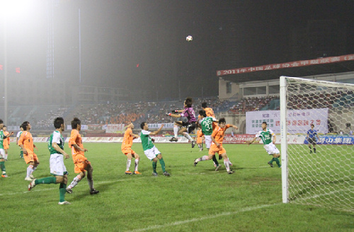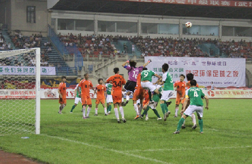 开场哨声吹响之后,有着主场之利的湖北中博队很快便占据了场上的主动。上半场仅仅第8分钟时,东道主利用“学生军”的一次防守犯规获得了前场定位球的机会。主罚球员将皮球开到禁区前沿,湖北中博于乱军之中头球攻破了“学生军”的大门。