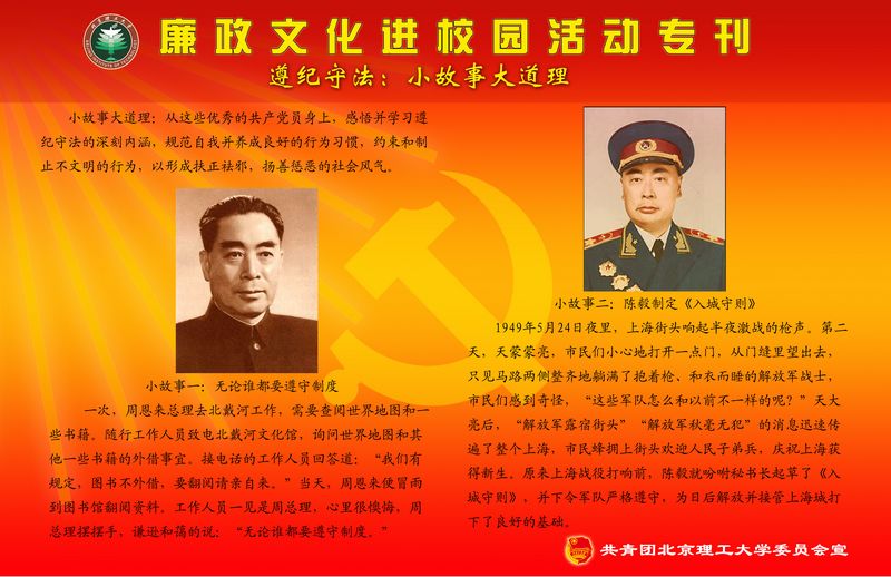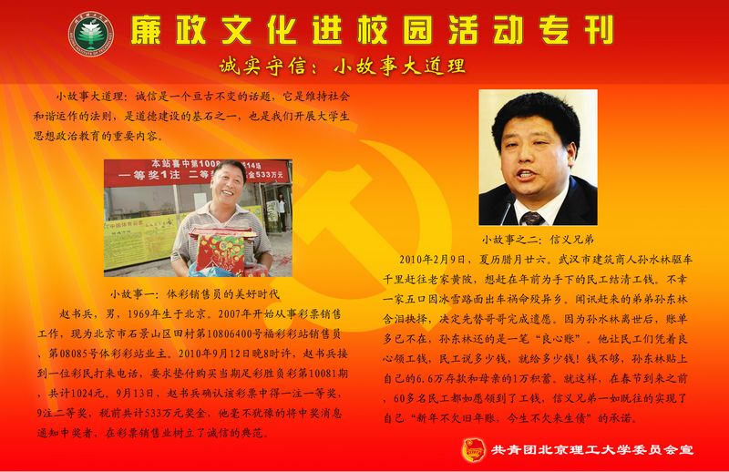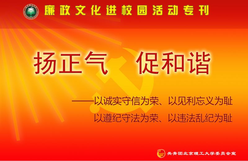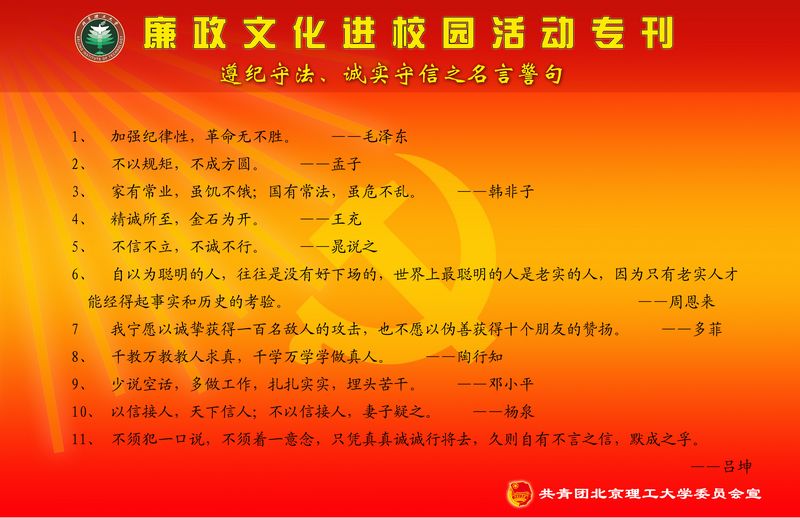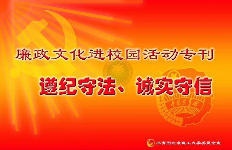 【编者按】按照学校《beat365中文官方网站2011年党风廉政建设宣传教育月活动实施方案》的要求,校团委从近日起,将依托校园网络、橱窗等主要宣传阵地,面向全校青年学生开展“遵纪守法 诚实守信”为主题的宣传工作,旨在通过在全校范围内进行主题宣传教育,加大廉政文化进校园宣传力度,进一步提高学生的纪律观念、法制观念和诚信意识。