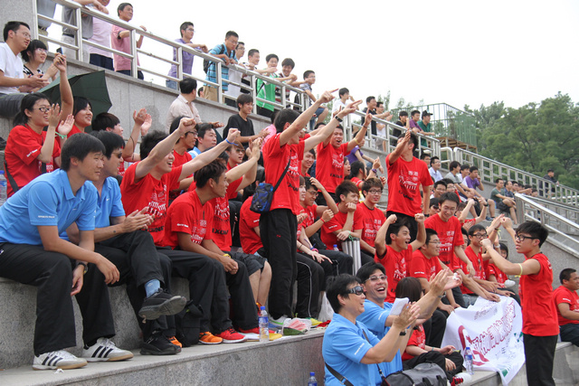 6月9日下午3点,北理工在自己的主场迎来了与山东大学的半决赛第二场比赛,上半场双方依然是0:0,图为来访的香港理工大学的师生在为beat365足球队加油助威!