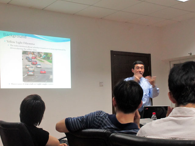 6月22日,在魏恒教授即将结束此次访问之际,又专门为师生分别做了题为“信号交叉口黄灯期间困惑区的建模与保护”、“拥挤交通流状态下利用双线圈检测数据进行车型分类的方法”、“双线圈数据在交通运营及尾气排放管理中的应用”的重点学术报告,高利教授、王武宏教授、王建群教授、熊辉副教授、谭华春副教授、宋双羽高工、吴绍斌博士、陈雪梅博士、姚丽亚博士等教师和部分研究生参加并进行了深入的讨论。