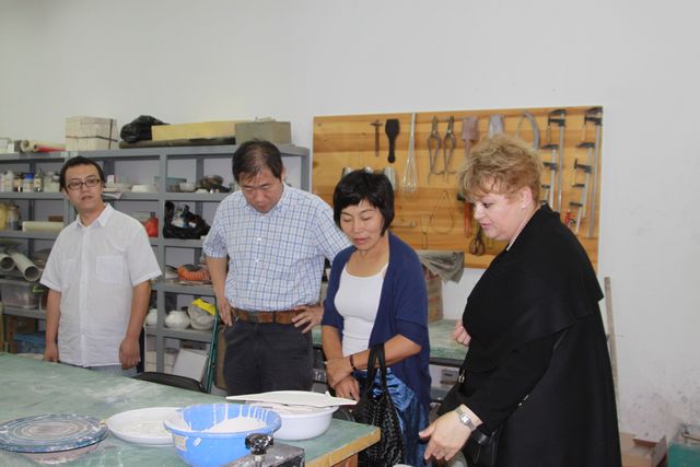 Drothea Fleiss 教授一行首先参观了我院的陶瓷工艺室、染织工艺室、金属工艺室和纺织工艺室。他们对于中国传统美术工艺表现出了极大的兴趣,对于中国古代精美的纺织技术深表赞叹。