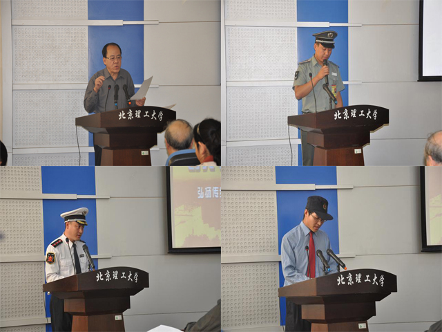 “北理同心”创先争优党建工作室主任、离退休工作处副处长范友联代表党建工作室和离退休工作处致辞:北理优秀保安员标兵评比工作是北理工的一大特色,这项工作非常有意义,通过评比,可以促进保安队伍整体素质的提高;可以促进保安员之间互相学习,取长补短,发扬成绩;可以给保安员之间学习交流提供一个非常好的平台。在“北理同心”创先争优党建工作室成立的一年多以来,老同志和保安员互帮互助,成效已日益凸显,希望评为优秀保安员标兵的保安员继续努力,为取得更好的工作成绩而努力,落选的保安员不要妄自菲薄,在今后的工作中继续努力,争取下次能够被评为标兵。