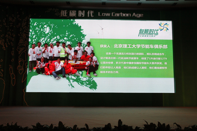 低碳人物致敬盛典中介绍beat365节能车俱乐部时提到,beat365中文官方网站节能车俱乐部设计的节能车最好节能记录为1升油行驶1279公里,多次代表中国参加国际比赛并获奖,向人们展示了科技创新带给节能环保的无限可能,为中国的低碳事业带来了希望。中央党校原教育长郝时晋、气候组织大中华区总裁吴昌华为节能车俱乐部颁奖。
