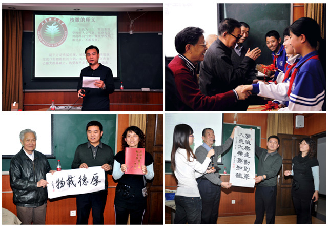 各位北理工安保思想疏导师代表学校向交大附中带队领导和学生们赠送《校园文化丛书》和《红色征途》光盘,同时,书法家伍惠然老师现场创作的书法作品以及张英志老师在家创作的书法对联也一并赠送。以勉励孩子们传承文化,奋发图强。