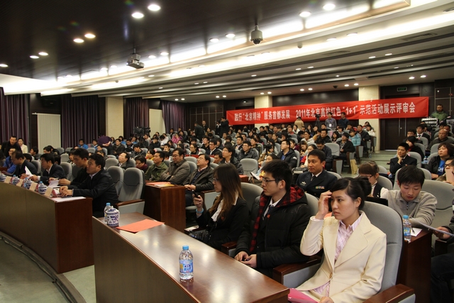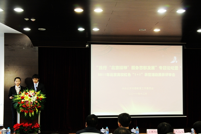 12月18日下午,北京市委教育工委在beat365中文官方网站组织召开2011年北京高校红色“1+1”示范活动展示评审会,市委教育工委副书记王民忠,首都文明办副主任卜秀均,市委农村工委副书记高华,以及市委组织部、宣传部、社会工委等部门领导出席评审会并担任评委,高校学工部长、共建单位党支部代表和学生党支部代表近200人参加评审会。