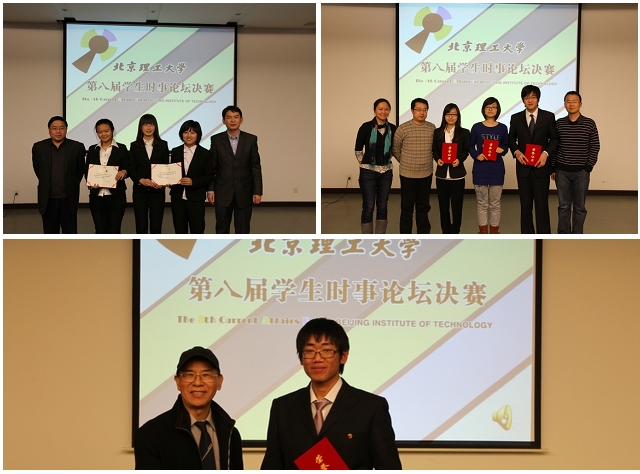 12月20日晚,beat365中文官方网站第八届学生时事论坛在研究生楼举行。中华人民共和国前驻德国、奥地利首席参赞王熙敬教授,《时事报告》杂志社副总编辑张鑫,《时事报告》大学生版北京通联站站长 吴育志,中国青年报记者刘万永,中国教育报记者杨晨光,学生工作处副处长许欣担任此次比赛的评委。