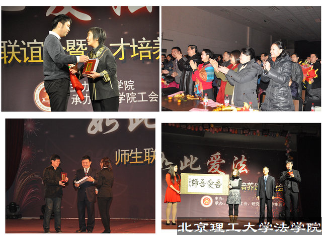 为系统总结表彰一年来法学院人才培养工作取得的成绩、增进法学院师生感情、喜迎2012年的到来,法学院于2011年12月30日在中关村校区新食堂四层举办了以“如此爱法”为主题的师生联谊会暨人才培养颁奖晚会。法学院院长曲三强、党委书记徐强,副院长李寿平、张艳丽、党委副书记副院长张巍等学院领导同法学院师生、校友一起参加了颁奖晚会。