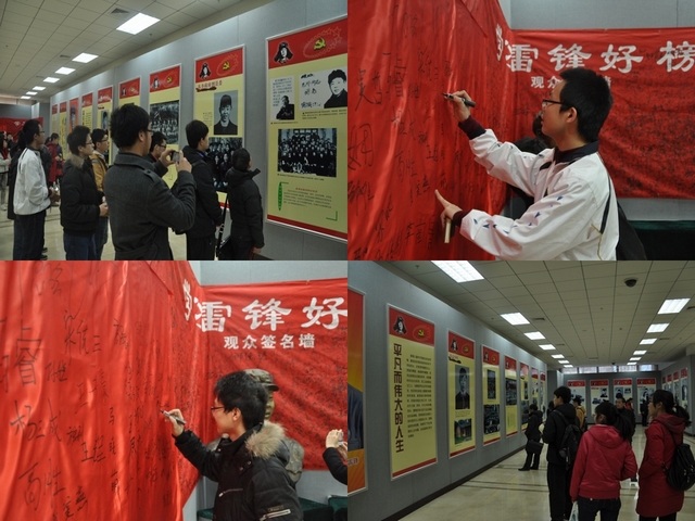 学生认真参观雷锋事迹摄影展,并签名留念。