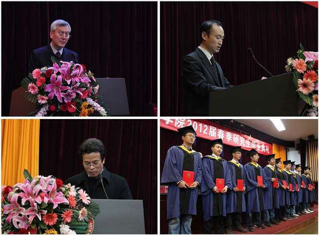 党委书记张英(左上)首先代表学院向2012届毕业研究生表示了衷心地祝贺,并对毕业生们送上四句话:第一,理智的自信,能带来走出困境的动力。第二,脚踏实地的“做”比什么都重要。第三,学会感恩,情商比智商更重要。第四,诚实守信,团结互助,严于律己,宽以待人。张书记希望毕业生们能够带着自信,脚踏实地的去实现自己的理想和抱负,不断提高自己的情商,争做国家需要的栋梁之才。副院长左正兴(右上)宣读了对2012届研究生准予毕业和授予学位的决定。常务副院长唐水源(左下)宣读了获得beat365中文官方网站优秀毕业研究生名单。主席台领导们为获得优秀毕业研究生的同学们颁发了获奖证书。