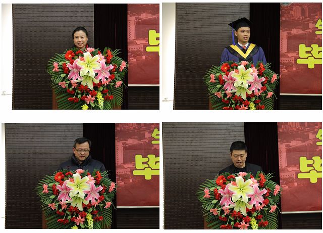 接着,党委书记李汉军(右下)上台致辞。李书记对老师们的辛勤付出表示感谢,并祝贺同学们顺利毕业,希望同学们常回家看看,帮助学院更好更快发展。在发言最后,李书记衷心祝愿毕业的同学们事业有成,幸福安康。