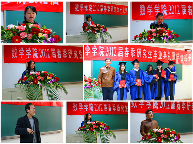 3月20日上午10:00,数学学院2012届春季研究生毕业典礼暨学位授予仪式在研究生楼106教室隆重举行,数学学院领导、教师代表以及辅导员出席,2012届全体毕业研究生以及部分家长和亲友代表参加了毕业典礼。毕业典礼由数学学院党委副书记衡靖老师主持。带着梦想与不舍,带着感恩与兴奋,毕业典礼缓缓的拉开序幕。