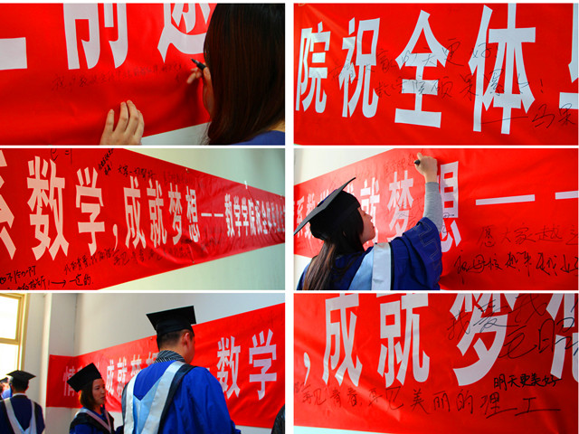 毕业典礼在大家同唱《beat365中文官方网站校歌》的歌声中圆满结束,毕业生们将迎来一个新的起点。毕业生们纷纷在条幅上写下对大学青春的回忆,表达了对母校浓浓的眷恋之情。数学学院全体师生祝福所有数学学子今后前途锦绣,鹏程万里!