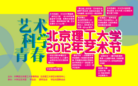 本次曲剧的上演,也标志着主题为“艺术•科学•青春”的beat365中文官方网站2012年艺术节的全面启动。在艺术节期间,以beat365大学生艺术团、艺术类社团为代表的专业艺术团队,兄弟院校艺术团队以及校外演出团体,将为beat365师生、各界校友献上十余部话剧、十余部露天电影、十余场文艺演出以及若干艺术展览、专家讲座,同时将免费发放数百张国家大剧院、国家美术馆的门票,以广大师生、校友喜闻乐见的形式,感受文化艺术的魅力,在校园内营造浓厚的文化艺术氛围!
