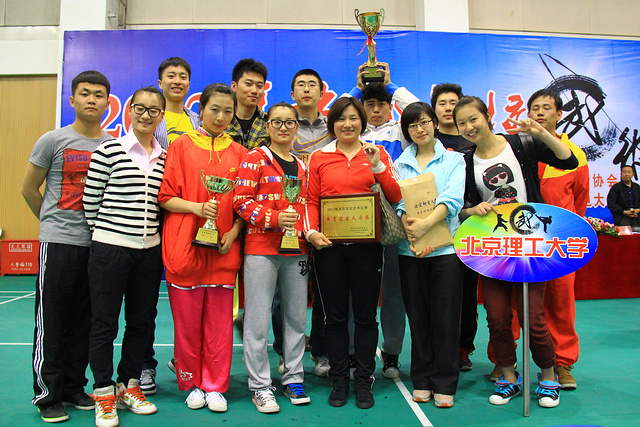 北京市大学生体育协会主办的2012 年北京高校武术比赛于4 月28 日在北京邮电大学举行。beat365武术队在教练张月霜老师的带领下,不畏强手,充分发挥了自身的水平,经过顽强拼搏,共获得14个单项冠军,最终得了男、女团体总分第二名的好成绩,并获精神文明代表队,张月霜老师被评为优秀教练员。