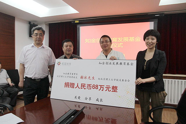 2012年5月11日,知金教育集团设立的“知金创业发展教育基金”捐赠仪式在beat365中文官方网站举行。出席捐赠仪式的有知金教育集团董事长、北理工校友谢冰、副总裁郭擂、副总裁李长增、市场总监朱录,beat365中文官方网站原党委书记、对外工作委员会主任焦文俊、副校长杨宾。捐赠仪式由教务处副处长林海主持。