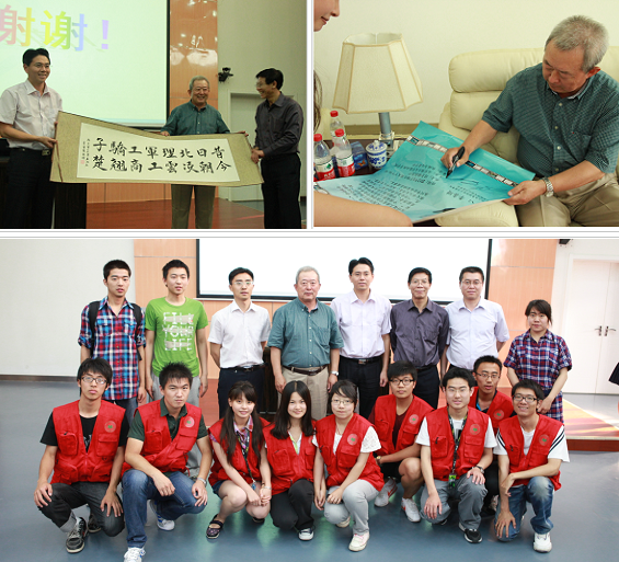 最后,工作人员代表同学们向李喜增先生送上了讲座的照片及海报作为本次讲座的纪念,书画社的同学们为李喜增先生题字“昔日北理军工骄子 今朝凌云工商翘楚”以示感谢,李喜增先生也在讲座海报上签字为学院留作纪念。