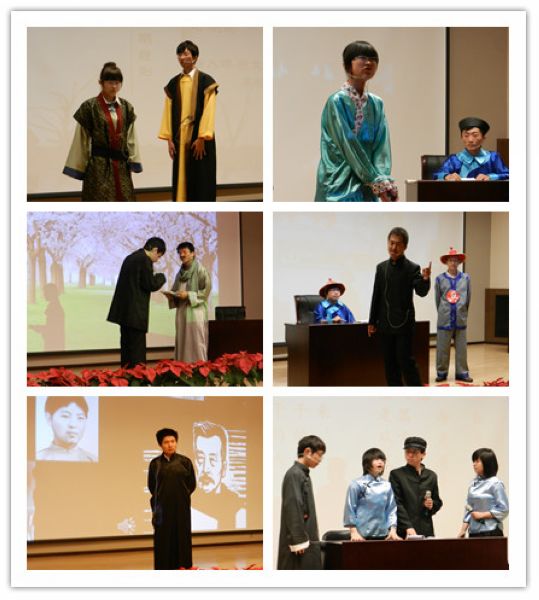 决赛共分为“知识问答”、“谈道论理”、“人文演绎”三个竞赛环节。知识问答,每组设有10道选择题,并于规定时间内做答,充分考察选手基础知识功底。谈道论理由大赛组委会事先准备7道题,为儒家或道家的言论一则,参赛小组现场抽题并发表限时即兴演讲。此环节检验了选手博厚的知识、流利的口才、深刻的思想。人文演绎环节将比赛推向了高潮,要求参赛选手深刻体会选定的人物,广泛查阅相关的资料,以优美典雅的文辞,运用一定的艺术手法,配合辅助手段充分演绎人物特点。参赛小组选定了秋瑾、鲁迅、林觉民等典型人物,充分运用背景、视频、音乐等手段,将人物形象的生动性、剧情的冲突性展现的淋漓尽致,文辞典雅、思想深刻。