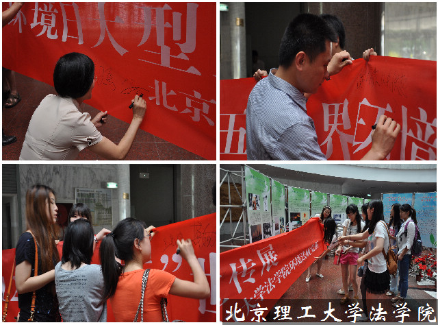 随后,现场师生积极地在“六•五世界环境日”条幅上签上自己的名字和“绿色消费”的承诺。