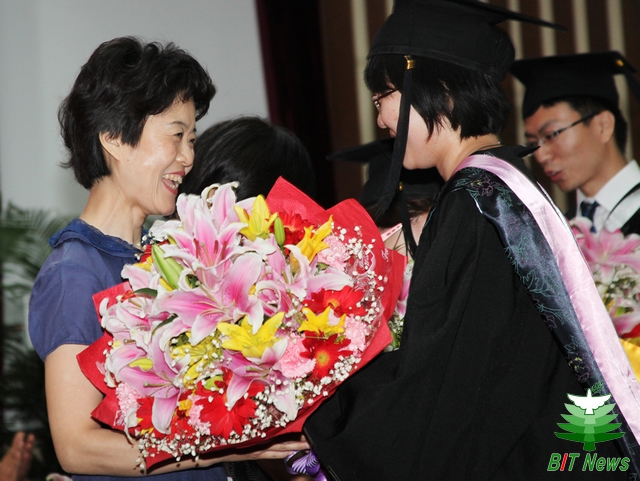 北京市教学名师、计算机学院李凤霞教授代表全校教师对毕业生表达了真挚的祝福,勉励同学们运用在大学中收获学习的能力终生学习,在“德以明理,学以精工”校训指引下志存高远、脚踏实地,并表示母校是北理工学子坚强的后盾,永远敞开怀抱欢迎大家。
