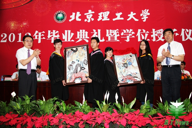 设计与艺术学院代表2012届毕业生向母校赠送纪念品——瓷砖画《青春·阳光》。《青春·阳光》用灵动的笔触和明快的色彩,展现了新一代大学生青春的风采和阳光的心态,更表达了对母校四年培育的感恩之情。