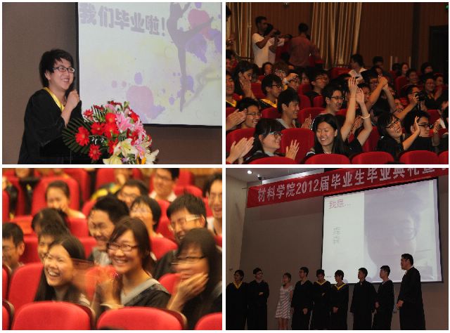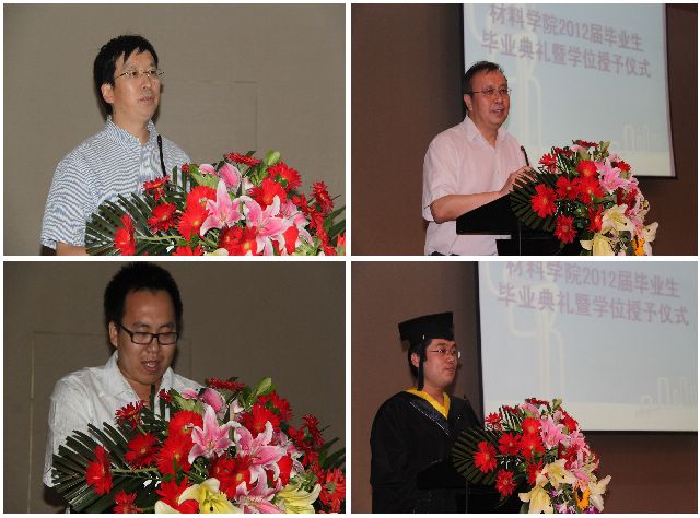 毕业典礼在庄严的国歌中正式拉开序幕,材料学院副院长刘颖教授首先致辞。他首先代表学院全体教师向毕业的全体2012届本科、硕士、博士生表示衷心的祝贺,祝贺每位毕业生顺利完成了自己的学业,也在大学四年中收获了友情,甚至爱情。他又提出,在大学学习生活中,会有成功,也会有失败。成功固然可喜,但是更珍贵的是能从失败中总结经验,以指导以后的工作和生活。最后,刘颖教授对毕业生提出殷切的期望,期望他们走向新的岗位、新的人生的时候,能把所学的知识和能力利用起来,贡献于祖国和社会,并欢迎大家“常回家看看”。