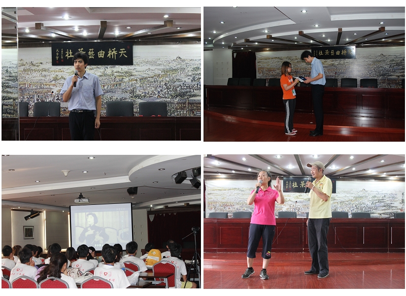 在两次活动的欢迎仪式上,天桥街道团工委书记王哲分别对远道而来的台湾、澳门同学们表示热烈的欢迎,希望大家来到天桥能够真正感受到地道的老北京文化,同时增进彼此交流,展现中华文化同根同源、和而不同的深厚魅力。澳门访学团的学生们向天桥街道赠送了精心准备的礼品,表达了对天桥街道热情接待的感谢。随后,天桥街道在具有民俗风味的“天桥曲艺茶社”里播放了《家在天桥》的主题宣传片,并由土生土长的天桥老艺人毛众老师为来自台湾、澳门的大学生分别介绍了天桥的历史文化,从老天桥的没落、到解放后天桥的复苏、再到当今天桥演艺园区下的新辉煌,全面的展现了天桥文化的精彩与活力。此外,毛众老先生还和天桥曲艺队的孙女士一起表演了一段精彩的相声节目,展现了当今天桥艺人的风采,赢得了在场观众的热烈掌声。