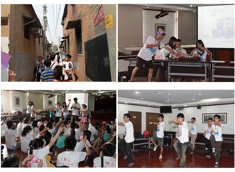 7月17日,在天桥实践团成员的带领下,来自台湾的同学们开展了“我家在天桥——胡同文化体验”活动。由天桥街道香厂路社区和留学路社区的小朋友们担任“天桥社区小导游”,带领着两岸的大学生们漫游胡同,体味活生生的老北京文化,寻觅那璀璨而朴实的民间艺术。在品味了悠久而地道的老北京传统文化后,台湾的大学生进行了“在水一方——台湾文化特色展示活动”。通过实际品茶、解释茶叶烘焙的过程、介绍茶叶的故事等环节具体而深刻的介绍了台湾的茶文化;随后,台湾访学团向大家展示了华美的客家花布,小朋友挑选了喜欢的花布样式,以红线和客家花布为材料制作了福气与富贵相映的“福蝶结”,小朋友们举着亲手做的“福蝶结”个个笑靥晏晏。此外,台湾大学生们还在现场进行了武禅表演、原住民舞蹈表演,展现了台湾的原住民文化,博得了全场的阵阵喝彩。