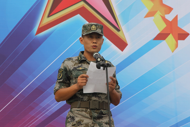十一连连长赵广健作为教官代表发言,保证全体教官做到几下几点:1思想上高度重视;2认真履行教官职责;3在训练中严密组织、耐心指导;4以身作则严格要求,坚持标准绝不松劲;5文明礼貌科学施教,使军训开展的认真活泼;6互相学习,共同提高,做到在训练中增进感情,促进友谊。