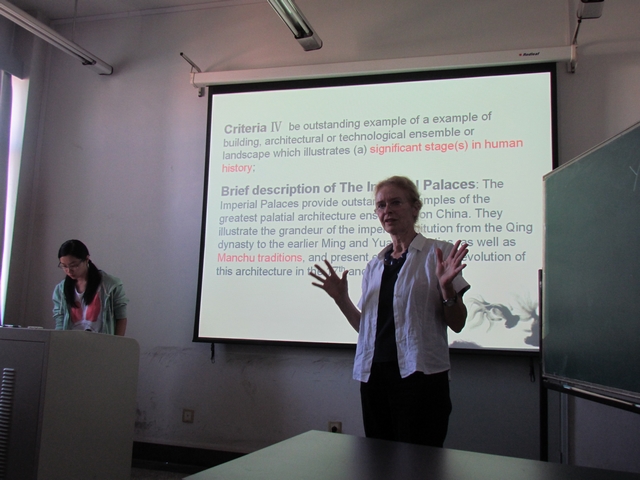 作为此次学术交流的重要组成部分之一,阿尔伯特教授为我院文化遗产系本科生和研究生进行了主题为“时间里的世界文化遗产”的小学期授课。阿尔伯特教授详细介绍了联合国教科文组织文化部门的功能和规范措施,并对“文化”、“文化遗产”、“非物质文化遗产”、“文化景观”、“自然遗产”、“纪念性建筑群”、“文化身份”、“普适价值”等多个关键学术术语以及对“1972年保护世界文化和自然遗产公约”(the Convention for the Protection of the World Cultural and Natural Heritage 1972)、“威尼斯宪章”(the Venice charter)等多个国际性法律、法规结合实例进行了详细的讲解。阿尔伯特教授还和同学们一起考察了世界文化遗产地——故宫,并结合文化遗产的原真性和完整性问题展开深入讨论。教授的严谨治学态度和平易近人的授课方式得到了与课师生的广泛好评。